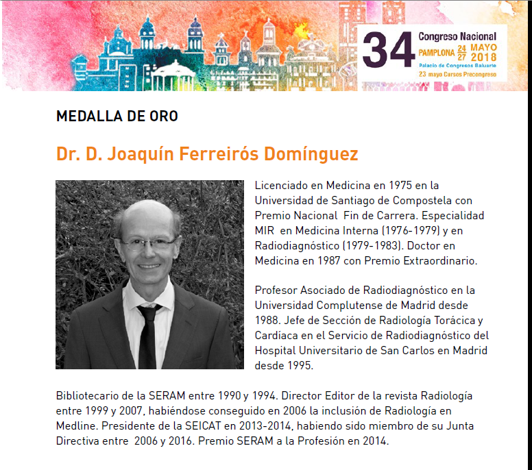 El radiólogo Dr. D. Joaquín Ferreiros Dominguez Responsable del Área de Imagen Cardiaca de RESONA, ha sido premiado con la medalla de oro de la Sociedad Española de Radiología (SERAM) En el último congreso nacional celebrado en Pamplona del 24 al 27 de mayo de 2018.